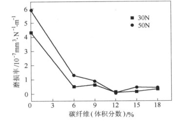 在摩擦过程中,短碳纤维能有效提高承载能力,保护材料不受犁削和剪切作用的破坏。犁削作用来源于犁沟效应,硬的金属在正压力作用下会嵌入软的高分子材料中即所谓的犁沟效应。犁沟效应的阻力是摩擦力的重要组成部分。硬度是描述材料局部抵抗硬物压入其表面能力的一个物理量。一般情况下,硬度越高,相同正压力硬金属嵌入相对软高分子材料中的程度就越低,犁削作用就会越小,磨损就越小。